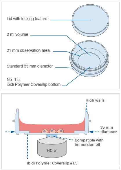 The μ-Dish 35 mm, high comes with a thin ibidi Polymer Coverslip Bottom that has the highest optical quality (comparable to glass) and is ideally suitable for high-resolution microscopy. It is also available with a #1.5H Glass Coverslip Bottom for TIRF or single molecule microscopy.
