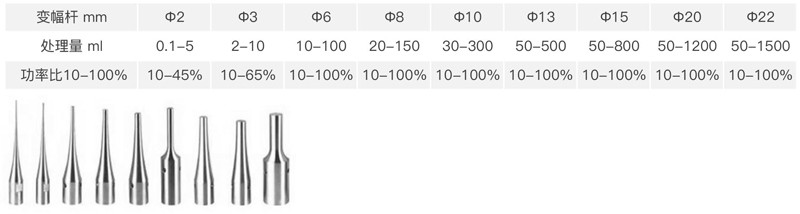 3.超声探头采用美标TC4材质的高纯钛合金,探头形状:锥形、鞭节形,发波形式:垂直超声。